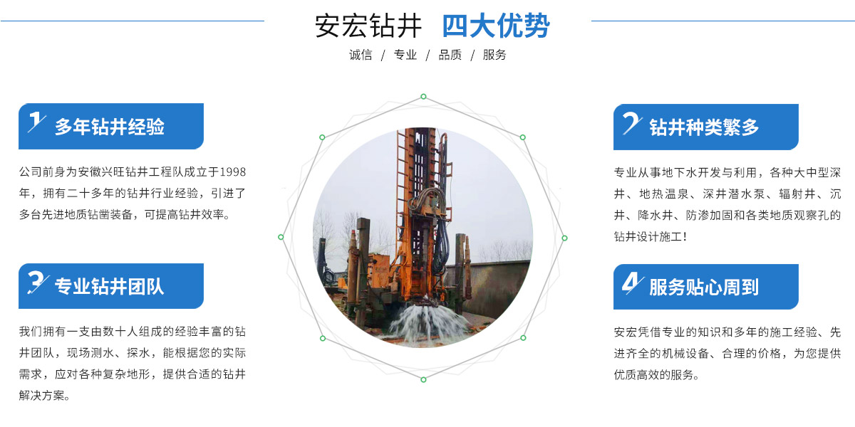 寧國市安宏鉆井工程有限公司,前為安徽興旺鉆井工程隊(duì)成立于1998年,公司從事安徽鉆井(宣城打井、寧國打井、蕪湖打井、池州打井、宿州打井、桐城打井、銅陵打井、南陵打井、郎溪打井、廣德打井、績溪打井、馬鞍山打井等),江蘇鉆井(南京打井、高淳打井...